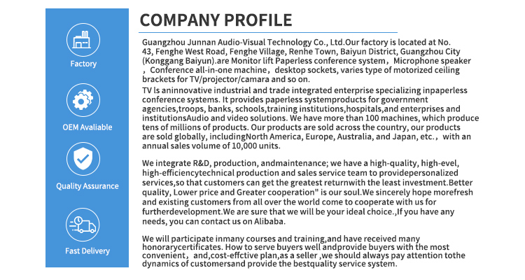 Zaawansowane elektryczne monitory LCD z ekranem OLED Monitory z podnośnikiem nadają się do wszystkich rodzajów scen. Dysponujemy technologią cięcia maszynowego CNC i technologią laserową, najnowszą technologią podnośnika ekranu LCD do stołów konferencyjnych, aby zapewnić, że produkt spełnia bardzo wysokie standardy. Wszystkie nasze podnośniki do ekranów LCD OLED należą do firmy Made in China i są dostępne w sprzedaży hurtowej, można je prywatnie dostosować do potrzeb klientów i mają wystarczającą ilość podnośników do monitorów LCD z ekranem dotykowym w magazynie, co zapewnia szybką dostawę do klientów. A nasz sprzęt Junnan posiada różnorodne certyfikaty, takie jak CCC, certyfikat CE, ROHS, certyfikat ISO, produkt jest bezpieczny i wysokiej jakości, z kwalifikacjami eksportowymi, jest bezpośrednią fabryką z korzystną ceną, ma własną fabrykę i działa od wielu lat.